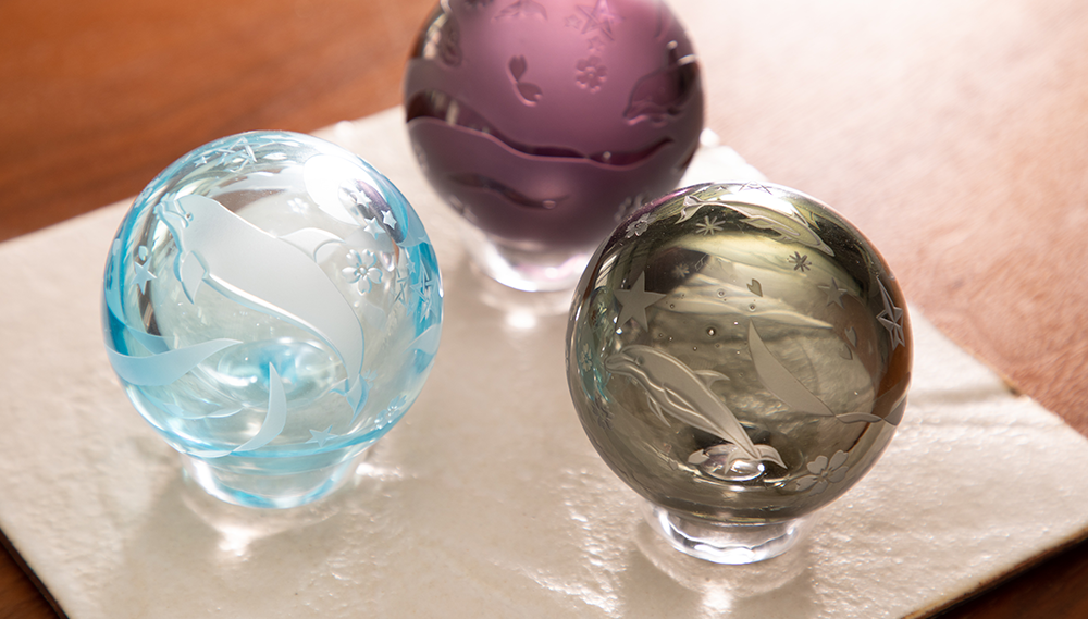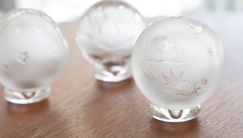サンドブラストとは、エアーコンプレッサーで砂を吹きかけて、ガラスの表面に彫刻を施す技法。 森山みちるは女性作家ならではの柔らかい表現で季節感のある作品を得意とする。