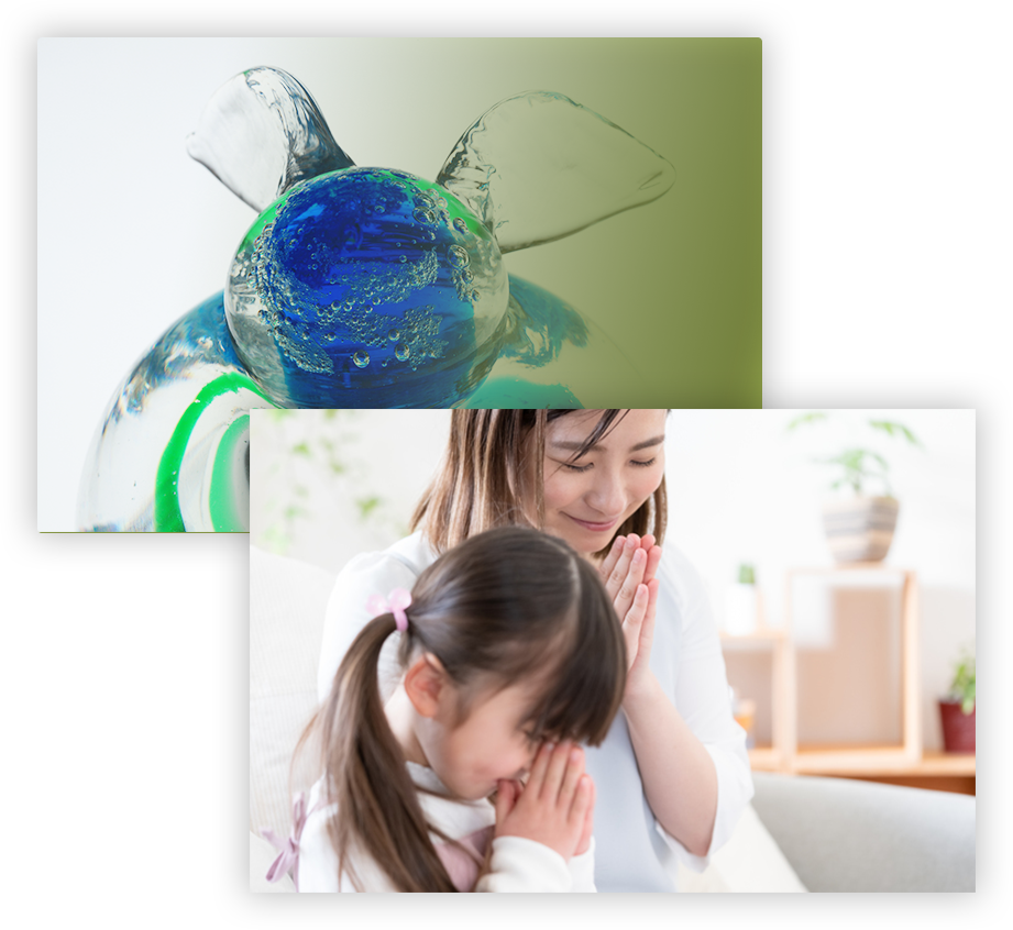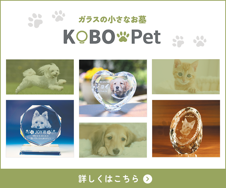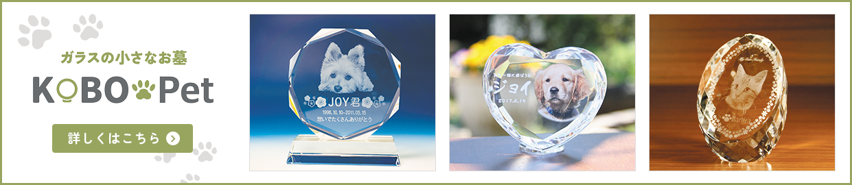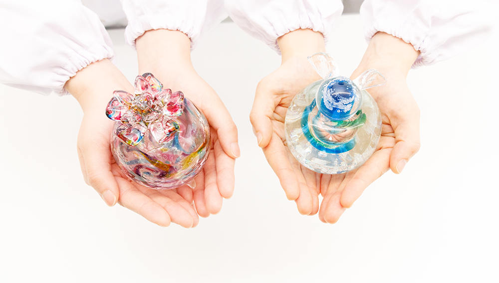 KOBOとは手のひらサイズのガラスの中に、粉骨したご遺骨を少しだけ入れた小さなお墓です。有名ガラス作家が一つ一つ手作りで作り上げたアート作品で、一つとして同じものはありません。