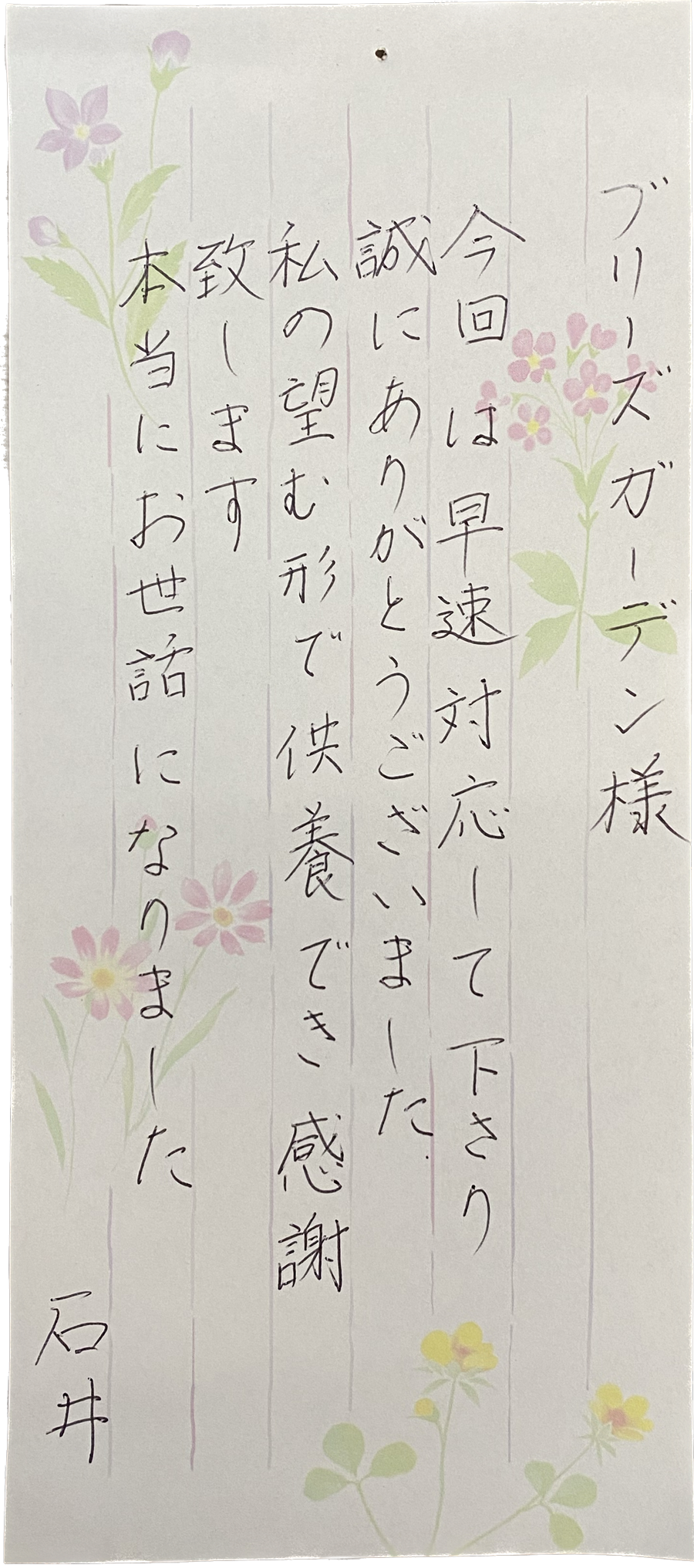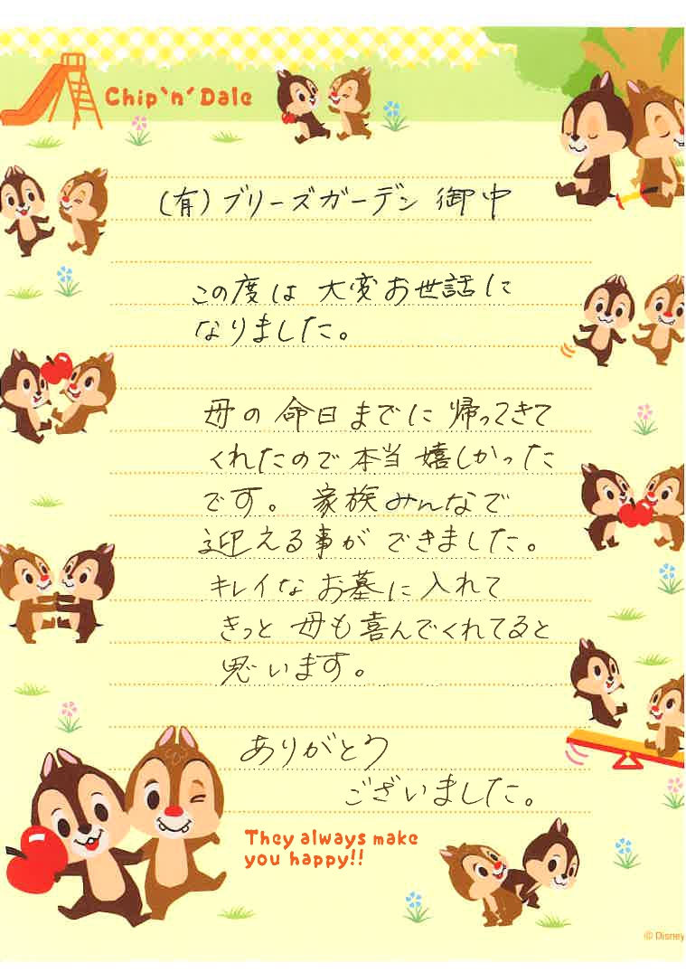 この度は理想的な形にお世話していただきまして有難うございました。美しくて可愛いガラスの入れ物に、 大切な彼が入って帰ってきました。作家は小樽の人と伺ったので、彼も北海道の人だったので喜んでいると思います。