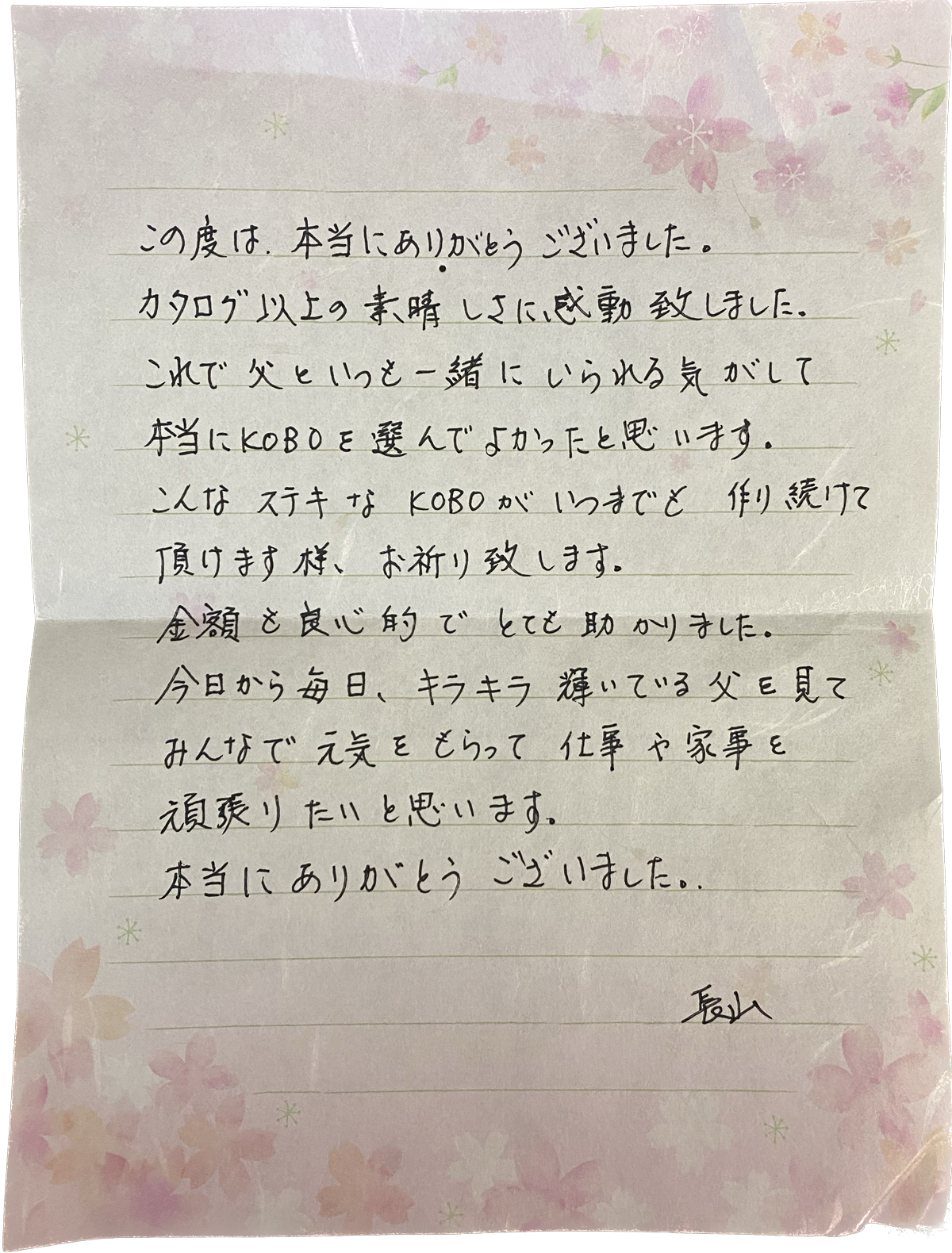 御社の海洋散骨は東京湾で、KOBOのおかげで近くに置くこともできて暖かい気持ちになりました。父と母のKOBOをそれぞれ兄と持つことを決めました。